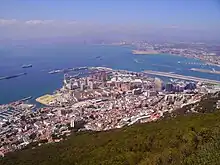 The North Mole at Gibraltar Harbour (pictured), in the British Overseas Territory of Gibraltar,[1] at the southern end of the Iberian Peninsula,[2] is one of a trio of breakwaters (shown on map) that provides protection to the harbour, in addition to that which results from the presence of the Rock of Gibraltar on its east side.[3] The North Mole is positioned at the northern and western aspects of the northern section of the harbour,[3][4] which is located just north of the east entrance to the Strait of Gibraltar.[5][6] The L-shaped breakwater includes a Western Arm which runs south toward the Detached Mole,[4][7] and measures 500 metres (1,600 ft) in length. The northern section of the harbour features the commercial port, which has a total length of almost 2,300 metres (7,500 ft) of quay on the North Mole (including its Western Arm) for cruise ships, cargo handling, and bunkering.[3] Fifteen berths are available,[8] including six on the Western Arm and two on an extension jetty.[3]