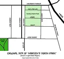As the growth of San Diego eventually caught up with the original Hartley lemon grove, it eventually became roughly bordered by Ray Street to the west, 32nd Street to the east, University Avenue to the north and Dwight Street to the south. Hartley deemed his area Hartley's North Park, and years later, the City of San Diego referred to the new suburb as North Park.