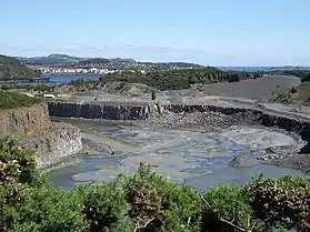 While transport and especially the railways and ferries have been North Queensferry's most obvious industries, one local industry that pre-dated the arrival of the railway is quarrying. In the north east of the peninsula on which North Queensferry stands there is a vast quarry, Cruicks Quarry, owned by Tarmac.[14] The stone is whinstone, or quartz dolerite, an extremely hard igneous rock found here as a geological sill. Dates vary, but the quarry has been worked at least since the 1820s. The quarry has been non-operational since 2009, although Planning Permission was granted by Fife Council in 2012 for further working.[15] The stone from the sill was crushed down to various sizes, most valuably the 10 to 14 mm size used for road surfacing.[16] In earlier times stone from the quarry was used to build the docks at Leith and Liverpool as well as many of the pavements of London. Ferryhills Road, which leads out of the village towards Inverkeithing, skirts the edge of this huge quarry. A viewing platform on the west is now overgrown, but the quarry can be seen by turning right at Jamestown into Cruickness Road, then following the road round to the old weighbridge. The pool occupied by Deep Sea World is also an old whinstone quarry.
