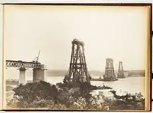 View of the construction of the Forth Bridge from North Queensferry