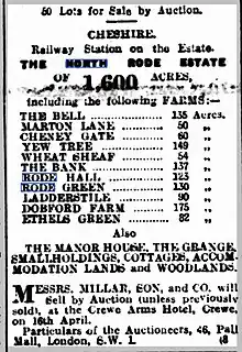 George Percival Daintry ran the North Rode Estate until 1923 and then decided to sell the whole property. The reason for the sale as stated in his obituary was high taxes.[15] All of the houses and cottages except Oaklands were put on the market in 50 lots. Many of the tenant farmers bought their own properties. George kept Oaklands and he lived there until his death in 1936. The sale notice is shown.