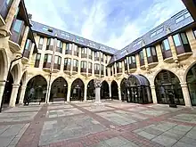 The first guildhall in Northampton was a 12th-century building at the junction of Gold Street and Horsemarket.[2] The second guildhall was an early 14th-century battlemented structure at the corner of Abington Street and Wood Hill; it was sold in 1864 and subsequently demolished.[2][3]