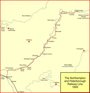 The proposal for the branch line went to the 1843 session of Parliament and the authorising Act was passed on 4 July 1843.[5] Robert Stephenson was the engineer of the line; work started in March 1844. The line was to leave the L&BR main line at Blisworth and descend considerably to Northampton. After that the line was to follow the River Nene on an easy alignment all the way to Peterborough. Stephenson’s design involved 26 level crossings, 13 river bridges and a short tunnel at Wansford.[6][4]