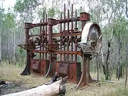 The 10-head stamper battery with steel frame is located about 80 metres (260 ft) from the creek. A concrete engine footing is located adjacent to the battery to the southeast. The posts for a partly-collapsed gantry, level with the top of the battery, lead south 22 metres (72 ft), then in a series of separate low embankments back to a mine adit 120 metres (390 ft) to the south. This appears to be the support embankment for a tramway linking the mine and is not demonstrated.[1]