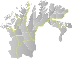 County Road 889 (Norwegian: Fylkesvei 889) is 85.3 kilometers (53.0 mi) long and runs between Smørfjord and Havøysund in Troms og Finnmark, Norway. The road runs through Porsanger, Hammerfest and Måsøy, and passes the small villages of Kokelv, Selkop, Lillefjord, Latter, Slåtten, Snefjord, Krokelv and Bakfjord. At Smørfjord, the road branches from E69. It crosses to Havøysund across the Havøysund Bridge. The section from Kokelv to Havøysund is designated one of eighteen National Tourist Routes in Norway.[1][2]