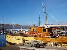 M/B “Hauka” is a 16.5-metre (54 ft) long vessel drawn by the engineer Richard G. Furuholmen and built at Moen Yard in Risør in 1934. The vessel was ordered by the company Albert Collett, and assigned to Salsbruket Pulp Mill where it was operative until 1985 except for the duration of World War II. The Germans then requisitioned it for their military base in Rørvik. The vessel was mainly used for towing of raw material to the pulp mill. In winter it could also be used for ice breaking whenever needed. Moreover, it was used to transport the owners and their families when they left the capital to come on a visit. The boat then looked glamorous, neatly cleaned and shined up for the occasion.