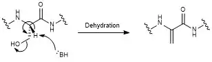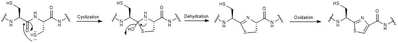 All moieties of the peptidyl backbone of nosiheptide were shown to originate exclusively from proteinogenic amino acids. The structural motifs include dehydroamino acids from the serine or threonine residues undergoing anti elimination of water, thiazoles from cysteine residues with cyclodehydration followed by deoxygenation, and the central hydroxypyridine produced by cyclization between two dehydroalanine acids with incorporation of an adjacent carbonyl group.[2]