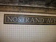 Both platforms have their original Dual Contracts-era IRT trim line and name tablets. The trim line has a tan-yellow center, brown border, and a spec of blue in-between. "N" tablets on a blue background and brown border run along the trim line at regular intervals. The name tablets read "NOSTRAND AVE." in serif font in gold lettering on a blue and brown background, a gold center, and brown border.