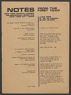 Notes from the First Year is based on speeches given by members and discussions held at the weekly meetings of the New York Radical Women in 1968. This pamphlet was part of a movement of mimeographed movement journals that coincided with the new radical feminism erupting in the United States.[15] Many pieces from this pamphlet were foundational in the development of what we now call women and gender studies.[16] The pamphlet notably marks the first appearance of the theory that would later grow into Anne Koedt's well-known pamphlet and book, The Myth of the Vaginal Orgasm.