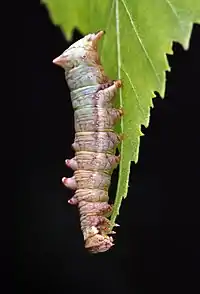 The larvae feed on Corylus avellana, birch, alder and oak.[1]