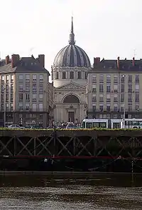 The basilica is located in Nantes at the Place du Sanitat, facing the Quai de la Fosse (Quay of the Pit). The dome which tops it is modelled on that of Les Invalides in Paris. At the top of the spire lies an archangel representing Saint Gabriel.
