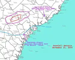 Heavy rains fell across northern portions of the state, with 4.13 inches (105 mm) measured at Chester. Snow mixed in with rain during the morning of November 21, leading to the earliest trace of snow on record in Charleston. Also, as the snow mixed in, thunder was heard, which is the first report of thundersnow in the history of Charleston. An inch of snow was reported just inland. Winds gusted to 44 mph (38 kn) at Folly Beach. The combination of pounding surf and high winds led to moderate to heavy beach erosion at Hunting Island, Folly Beach, Isle of Palms, Wild Dunes, and Sullivan's Island.[6]