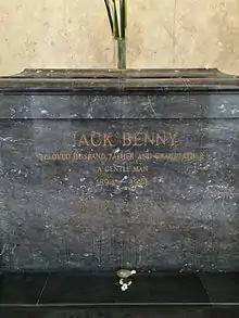 In October 1974, Benny cancelled a performance in Dallas after suffering a dizzy spell, coupled with numbness in his arms. Despite a battery of tests, Benny's ailment could not be determined. When he complained of stomach pains in early December, a first test showed nothing, but a subsequent examination showed that he had inoperable pancreatic cancer. Benny went into a coma at home on December 22, 1974.[3] While in a coma, he was visited by close friends, including George Burns, Bob Hope, Frank Sinatra, Johnny Carson, John Rowles and then Governor Ronald Reagan.[30] He died on December 26, 1974, at age 80. At the funeral, Burns, Benny's best friend for more than fifty years, attempted to deliver a eulogy but broke down shortly after he began and was unable to continue. Hope also delivered a eulogy in which he stated, "For a man who was the undisputed master of comedic timing, you would have to say this is the only time when Jack Benny's timing was all wrong. He left us much too soon."[31] Benny was interred in a crypt at Hillside Memorial Park Cemetery in Culver City, California.[32] His will arranged for a single long-stemmed red rose to be delivered to his widow, Mary Livingstone, every day for the rest of her life.[33] Livingstone died eight and a half years later on June 30, 1983, at the age of 78.[34]