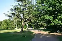 The park and its manor house, Nowton Court, built in 1837, was owned by the Oakes family, headed by Henry Oakes, also lord of the manor of Nowton, from 1837 until his death.[2] Nowton Court is now a nursing home called 'Nowton Court Village'.[3] There is an avenue of lime trees planted around 1880. It offered Nowton Court a view to the northern boundary, in spring over 100,000 daffodils bloom beneath the trees.[4]