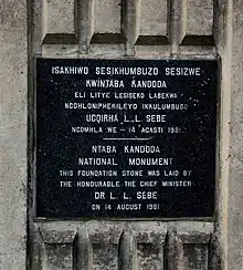 The National Monument of the Republic of Ciskei: Ntaba kaNdoda is located in Dimbaza, South Africa. It was commissioned by President of Ciskei Lennox Sebe, and was opened by him on August 14, 1981.[1] The memorial was created with the intention of commemorating those Xhosa chiefs who died in the dispute with the white colonizers over land use rights.[2]