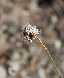 The Eriogonum nudum plant is a tall, bare, leafless stem, bifurcating into more stems, each topped with rounded clusters of white or pale pink or yellow flowers growing up to six feet from a basal rosette at the ground, where the flat green leaves are located. An striking characteristic is that flower clusters typically occur at the branch as well as the branch tips. The naked stem gives the plant its common name.