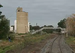 Present facilities at the station include a disused platform, a station building, now leased to a local business, a footbridge over the tracks, and grain silos. The station once had a turntable but it has been replaced by a small garden.