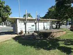 The Nundah air raid shelter stands on a small triangular wedge of grassed reserve. It is a rectangular concrete structure comprising a flat roof supported by concrete piers. Two-thirds of the shelter accommodates public toilets enclosed by concrete block walls and a mural is painted around the exterior walls of the building. The concrete floor slab is topped with a concrete pebble finish and the floor within the toilet area is tiled. The piers have wall tiles on the lower ends, and a timber seat is fixed onto the floor slab outside the ladies toilet. Wiring has been introduced for lighting, and skylights have been cut through the yellow roof slab inside the toilets.[1]