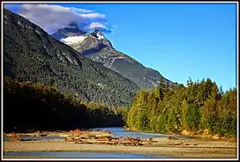 Nusatsum Mountain (2,575 m/8,448 feet),[3] is a mountain in the Pacific Ranges of the Coast Mountains of British Columbia, Canada, located near the Nusatsum River and south of and between the communities of Firvale and Hagensborg. The peak can be seen from Highway 20. The mountain is the equivalent of Mount Ararat in the traditions of the Nuxalk, as the place where survivors found refuge from the Great Flood.[4] The landform's toponym was officially adopted March 13, 1947, by the Geographical Names Board of Canada.[2] Other spellings of Nusatsum seen on older maps include "Nootsatsum", "Noosatum" and "Nutsatsum".[4]