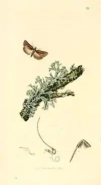 S. revayana Scop. Forewing ashy grey, dusted with darker, especially in costal half of median area; lines darker, double, but indistinct;the inner outcurved above and below middle, and angled outwards below vein 1; the outer irregularly waved and strongly indented on submedian fold ; some faint dark spots indicate the submarginal line ; hindwing pale greyish fuscous; — in the ab. fusculana Schmid the ground colour is dull dark brownish fuscous, with the black lines visible and a ferruginous spot representing the reniform stigma; from the middle of base an oblique black streak runs to lower end of the inner line ; the submarginal spots are visible, and a row of small black marginal lunules; — ab. dilutana Hbn. has the ground colour dull grey or whitish grey, the median area brownish grey, more purely brown towards costa; the reniform diffuse, rufous; the pale basal area with grey spots between the veins between subbasal and inner lines ; the submarginal spots darker grey and the pale submarginal line beyond them more clearly marked; — ab. degenerana Hbn. is bright greenish white; the median area purplish grey and brown, blacker towards costa, the reniform purple red; the lines filled up with white and the cloudy spots in basal and marginal areas black; a black spot at apex ; fringe whitish ; intermediate forms occur between this and dilutana ; the ab. obscura ab. nov. has the whole forewing olive brown, the markings as in degenerana; — ab. glaucana Lampa has the forewing obscurely glaucescent, with a triangular dark fuscous blotch; — ab. ilicana F. (= punctana Hbn.) is pale fawn grey, sprinkled with whitish scales; the lines much finer; the cell spot, a spot on each side of the median vein before inner line, and the two lowest spots of the submarginal line black; — in ab. ramosana Hbn. (= ramulanus Curt.) the ground colour is brownish grey, with fuscous shading, and a deep black streak from below base of cell to below reniform stigma, shortly branched towards inner margin beyond subbasal and inner lines; the submarginal spots darker; — ab. russiana Dup. has the forewing grey green, with a large dark median blotch. Larva green with the segmental incisions yellowish, the tubercles with long white.[1] The wingspan is 20–25 millimetres (0.79–0.98 in).