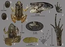 1. 1 2 3 4 5 6 7 8 9 10 11 12 Garg, Sonali; Suyesh, Robin; Sukesan, Sandeep; Biju, S. D. (2017-02-21). "Seven new species of night frogs (Anura, Nyctibatrachidae) from the Western Ghats biodiversity hotspot of India, with remarkably high diversity of diminutive forms". PeerJ. 5: e3007. doi:10.7717/peerj.3007. ISSN 2167-8359. PMC 5322763. PMID 28243532. This article incorporates text from this source, which is available under the CC BY 4.0 license.
