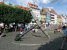The great Memorial Anchor (Danish: Mindeankeret) at the end of Nyhavn, where it meets Kongens Nytorv, is a monument commemorating the more than 1,700 Danish officers and sailors in service for the Navy, merchant fleet or Allied Forces, who sacrificed their lives during World War II. The Anchor was inaugurated in 1951, replacing a temporary wooden cross erected on the spot in 1945, and has a plaque with a monogram of King Frederik VII on it. The Memorial Anchor is from 1872 and was used on the Frigate Fyn (Funen), which was docked at Holmen Naval Base during the Second World War. Every year on May 5 – Denmark's Liberation day 1945 – an official ceremony is held to honour and commemorate the fallen at the Memorial Anchor.[5]