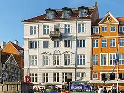 The corner building was constructed as a warehouse for skipper Jens Larsen in 174446.[1] The facade on Nyhavn featured a four-bay, rounded wall dormer with the '1744' written above the windows. The facade on Toldbodgade featured a crow-stepped gable.