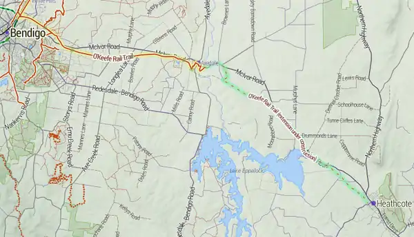 The O'Keefe Rail Trail is a 50-kilometre (31 mi) rail trail connecting Bendigo with Heathcote. The sandy gravel trail runs along a former branch line on the Melbourne-Sydney rail line. It previously ran 17 km (11 mi) from Bendigo to Axedale but works completed in 2015 extended the route to Heathcote [1]