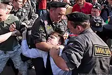 - OMON have broken up several opposition rallies, including the Dissenters' Marches since 2006, sparking reports of police brutality, including excessive use of force and arbitrary detention of participants.[20] In 2007, the brutal actions of OMON against peaceful protesters and arrests of opposition figures were harshly criticised by the European Union institutions and governments.[21] Moscow OMON also made international news when it prevented gay rights activists (including the European Parliament members) from marching after the Mayor of Moscow Yury Luzhkov did not allow a planned parade to take place in 2007.[22]