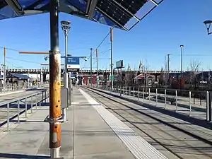 OMSI/Southeast Water station is a light rail station on the MAX Orange Line, located at 2210 Southeast 2nd Place on the east foot of the Tilikum Crossing bridge in Portland, Oregon.[1] Like South Waterfront/SW Moody Station on the west side of the Willamette River, it consists of two island platforms. MAX trains stop on the outside of the platforms, while TriMet buses stop on the inner lanes. Just northwest of the platforms is a Portland Streetcar stop served by the A and B Loop lines. The station is named after the nearby Oregon Museum of Science and Industry.[2]