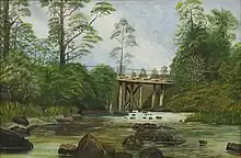 Bridge on the Oakley Creek by Mina Cox, showing a view of the creek circa 1883