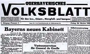 After the Second World War, the United States' occupation force in Bavaria wanted to build up a manageable number of medium-sized regional newspapers with higher circulation instead of the small-scale press landscape prevailing until 1945 with numerous local newspapers. In Upper Bavaria, new newspapers were licensed by the U.S. only in Munich, Ingolstadt, Rosenheim, Garmisch-Partenkirchen and Bad Reichenhall. The license for a new newspaper in Rosenheim was awarded to Leonhard Lang and Ernst Haenisch. On October 8, 1945, the new Rosenheimer daily entitled Oberbayerisches Volksblatt was approved by the U.S. military government in Munich. The license referred to the city of Rosenheim and the former districts Rosenheim, Bad Aibling, Wasserburg and Mühldorf. The Oberbayerische Volksblatt, approved with "License No. 6",[4] was the sixth new newspaper in Bavaria. The first issue appeared on October 26, 1945.
