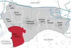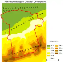 Obermehnen is a village in the German state of North Rhine-Westphalia in the county of Minden-Lübbecke. The village belongs administratively to the town of Lübbecke. Obermehnen has 1,360 inhabitants and an area of 9.6 km². At around 137 people per km² Obermehnen has the lowest density of all of Lübbeck's districts, not least because 4.3 km², i.e. 45%,[2] of the parish area consists of uninhabited hill forest on the Wiehen Hills. Obermehnen is thus the most wooded part of the borough of Lübbecke.