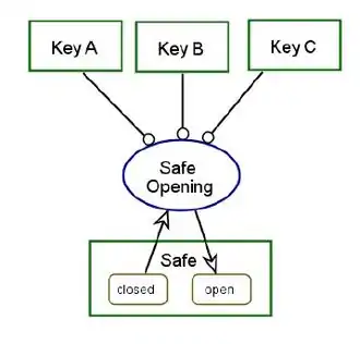 The logical operators AND, XOR, and OR among procedural relations enable specification of elaborate process precondition and postcondition. Separate, non-touching links shall have the semantics of logical AND. Here, unlocking the safe requires all three keys.