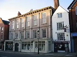The hall was originally a town house built in 1676 for Lady Mary Calverley. She had petitioned the City Assembly for permission to demolish her house, which contained a section of the Chester Rows, and replace it with a new house. This was granted, but as it led to the loss of a portion of the Rows she was fined £20 (equivalent to £3,600 in 2021).[2][3] It was the first building in central Chester to be designed in classical style.[3] During the early 18th century the house was occupied by John Williams, a local attorney general. Since that time the building has been used for various purposes, including a school, a club, offices, and shops. The access to the building was altered in the late 19th century. Also in that century a sixth bay was added to the north, and in the later part of the century the ground floor was projected forward to incorporate shops.[1] As of 2011 it is in use as a restaurant and hotel called Oddfellows Chester and a part of the Oddfellows hotel group of boutique hotels.[4]