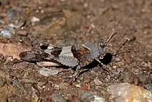 The blue-winged grasshopper, Oedipoda caerulescens,[1] is a grasshopper in the genus Oedipoda.
