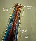 Adult worms of all Oesophagostomum spp. exhibit a cephalic groove by its proximal gut as well as a visible secretory pore, or stomum, at the same level of the oesophagus19. Like other nematodes, Oesophagostomum spp. contain a developed, multi-nucleate digestive tract as well as a reproductive system. Their developed buccal capsule and club-shaped oesophagus are useful for distinguishing Oesophagostomum spp. from hookworms.[12]