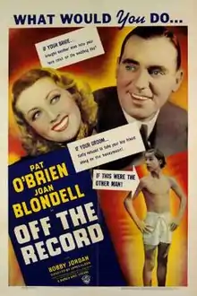 Off the Record is a 1939 American drama film directed by James Flood and written by Niven Busch, Lawrence Kimble and Earl Baldwin. The film stars Pat O'Brien, Joan Blondell, Bobby Jordan, Alan Baxter, William B. Davidson and Morgan Conway. The film was released by Warner Bros. on January 21, 1939.[1][2][3]