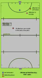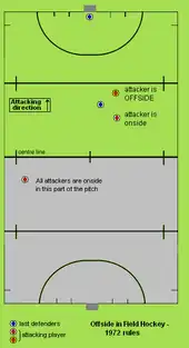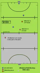 There is currently no offside rule in field hockey. There were prior offside rules, rules that restricted the positioning of players from the attacking team in a way similar to the offside rule in association football. The evolution of the field hockey offside rule culminated with its abolition in the mid-1990s.