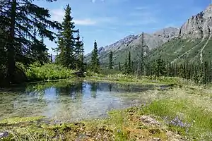 The vegetation is alpine and subalpine. The ground cover is 23% low herbaceous cover, 19% shrub, 17% is closed evergreen forest, 11% is open forest, and 28% is bare or has sparse vegetation.[3] The open forest is characterized by discontinuous stands of white spruce (Picea glauca), alpine fir (Abies lasiocarpa) and lodgepole pine (Pinus contorta). These are typically surrounded by lower willow (Salix spp.), dwarf birch (Betula spp.) and northern Labrador tea (Rhododendron subsect. Ledum). There are extensive stands of paper birch (Betula papyrifera) in the north. The higher elevations see alpine tundra of lichens, mountain avens (Dryas octopetala), shrubs (Ericaceae), sedge (Carex spp.), and cottongrass (Eriophorum spp.).[4]