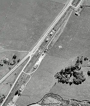 A goods shed was built in 1893.[5] When New Zealand Railways Department took over in 1908, tablet signalling was introduced. The station was improved in 1909, the platform extended south by 2½ chains and cattle yards built, so that by 1911 it had a shelter shed, platform, cart approach, 25 ft (7.6 m) by 13 ft (4.0 m) goods shed, loading bank, cattle and sheep yards and a passing loop for 56 wagons (extended in 1913 to 70 wagons, in 1940 to 90 wagons and in 1956 to 100 wagons).[10] Electricity was connected in 1930.[11]