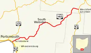 State Route 140 (SR 140) is an east–west state highway in the southern portion of the U.S. state of Ohio. The highway has its western terminus in Portsmouth at a diamond interchange with U.S. Route 52. Its eastern terminus is at State Route 93 approximately 2.75 miles (4.43 km) south of Oak Hill.