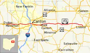 State Route 172 (SR 172) is an east–west state highway in the northeastern portion of the U.S. state of Ohio. Its western terminus is at its interchange with U.S. Route 30 (US 30) about one mile (1.6 km) west of East Greenville near Dalton, and its eastern terminus is at US 30 about two miles (3.2 km) west of Lisbon. The route stays near US 30 for its entire route, and some of the current Route 172 actually served as previous alignments of US 30.