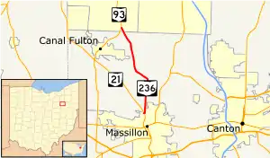 State Route 236 (SR 236, OH 236) is a two-lane northsouth state highway in the northeastern portion of the U.S. state of Ohio. Its southern terminus is at a signalized intersection with State Route 21 in the northern end of Massillon. The northern terminus of the route is at a Y-intersection with State Route 93 in New Franklin. The route follows part of the Ohio & Erie Canal Towpath.