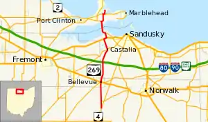 State Route 269 (SR 269) is a northsouth state highway in the north central portion of the U.S. state of Ohio. Its southern terminus is at SR 4 on the HuronSeneca county line nearly seven miles (11 km) south of Bellevue, and its northern terminus is at the entrance to East Harbor State Park near Marblehead.