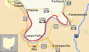 The original route was certified in 1932; originally routed from Letart Falls (about 6 miles (9.7 km) south of Racine) to 10 miles (16 km) east of Letart Falls.[3][4] The highway was extended to Racine in 1937 along a previously unnumbered road from Letart Falls to Antiquity, and along the former SR 337 from Antiquity to Racine.[5][6] SR 338 was extended 8.5 miles (13.7 km) east of Racine along the previous and current alignment of SR 124.[7]