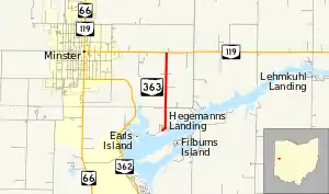 State Route 363 (SR 363) is a short northsouth state highway located in west-central Ohio. The southern terminus of this spur route is along the shores of Lake Loramie approximately two and a half miles (4.0 km) southeast of Minster, where the roadway becomes known as Lotus Road. The northern terminus of SR 363 is at a T-intersection with SR 119 about one mile (1.6 km) east of Minster.
