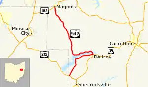 State Route 542 (SR 542) is a state highway in western Carroll County, within the eastern side of Ohio. The route runs 15.8 miles (25.4 km) long and connects SR 212 near Sherrodsville to Magnolia at SR 183 by way of Dellroy and Atwood Lake.