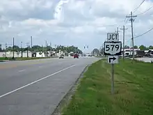 A signalized intersection with SR 51 in Lake Township just south of Northwood marks the starting point of SR 579. The route starts out in a northeasterly direction, but as it sweeps by the southeast corner of the former Woodville Mall, it turns due east, as it lines itself up with the boundary between Lake Township and the City of Northwood. SR 579, which starts out briefly as a five-lane road, quickly narrows down to two lanes, and enters into a more rural setting. Passing by a mix of generally flat open space and subdivisions, SR 579 intersects Bradner Road and Millbury Road on the way to its intersection with Fostoria Road, which marks the boundary between Wood and Ottawa Counties.[3]