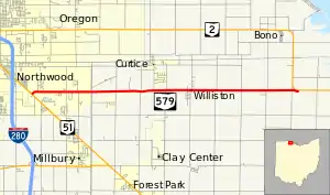 State Route 579 (SR 579) is an eastwest state highway in northwestern Ohio, a U.S. state. The western terminus of SR 579 is at SR 51 just south of the city limits of Northwood. Its eastern terminus is at a T-intersection with SR 2 approximately four miles (6.4 km) to the east of Williston.